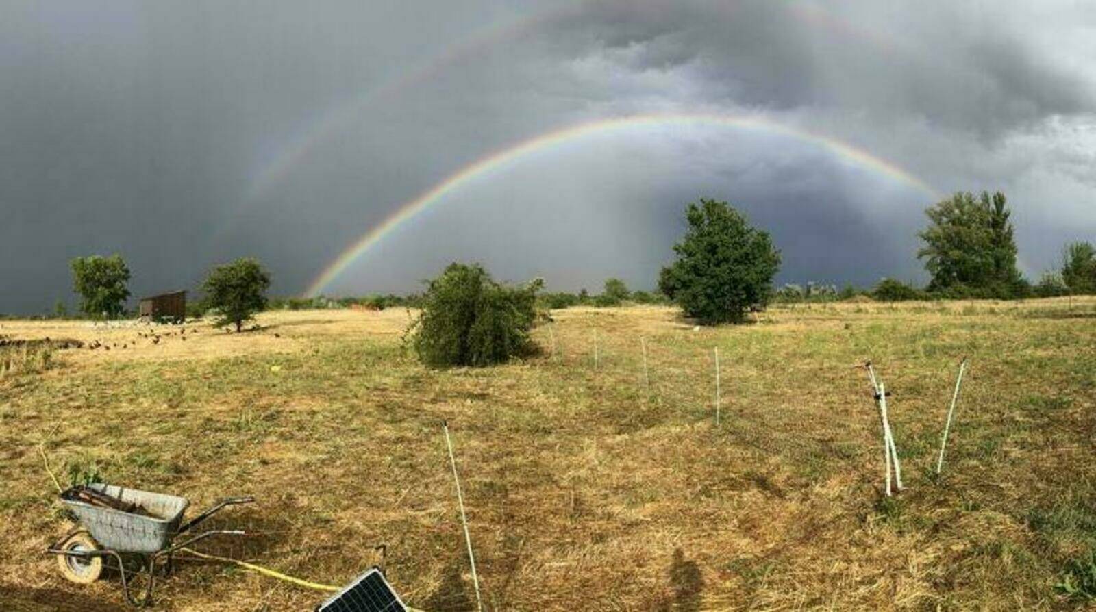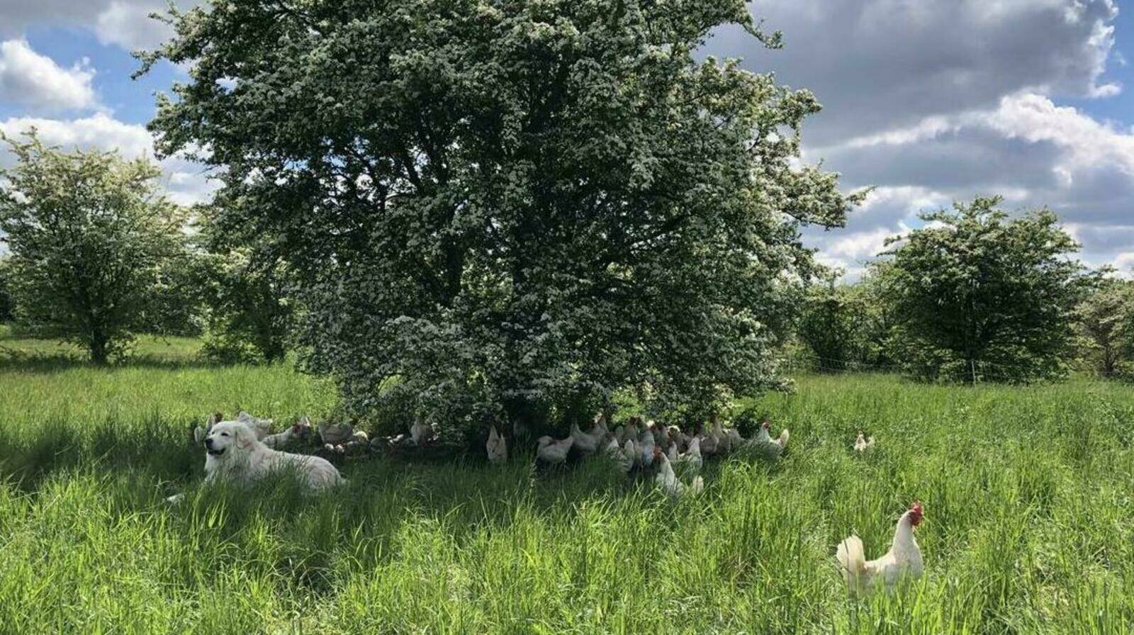 Auf dem Grünland tummelt sich unsere Hühnerschar mit den Herdenschutzhunden. Durch den Weideumtrieb kommen alle in den Genuss, regelmäßig neues Land zu erobern und sich frische Gräser und Kräuter schmecken zu lassen. Was einen Mehraufwand für uns bedeutet, hilft den Tieren und der Erde gesund zu bleiben.